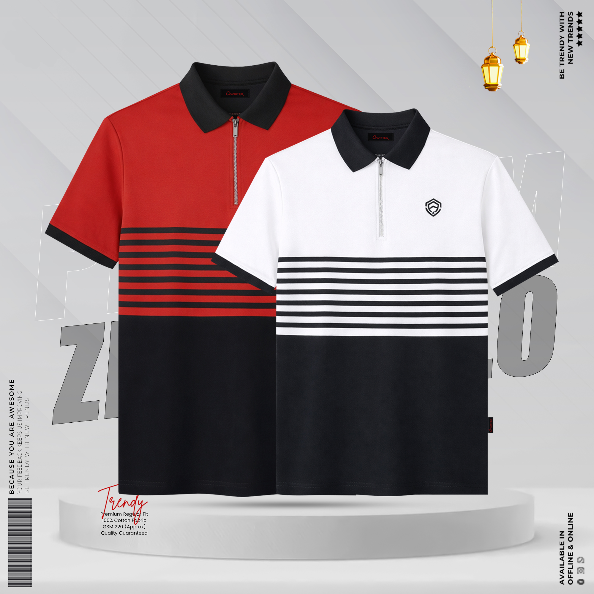 Premium Quality Half Zipper Contrast Polo Shirt Combo